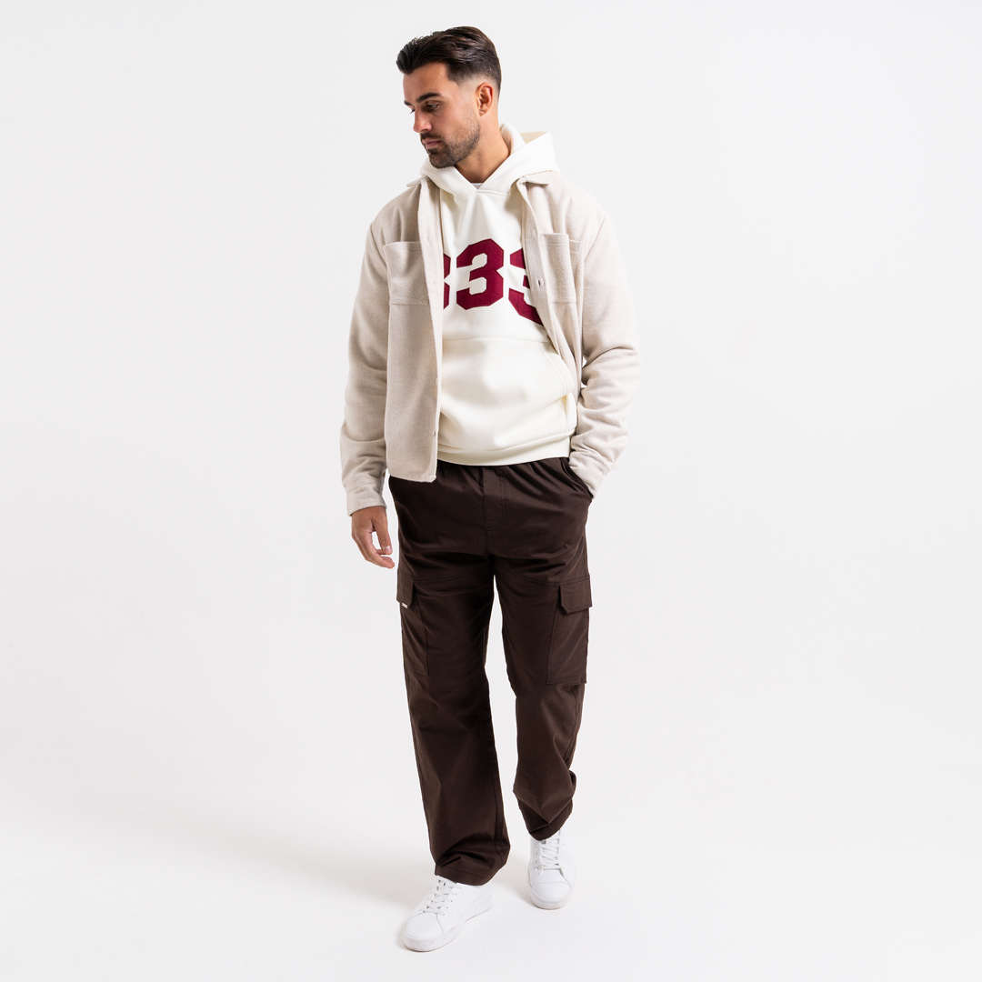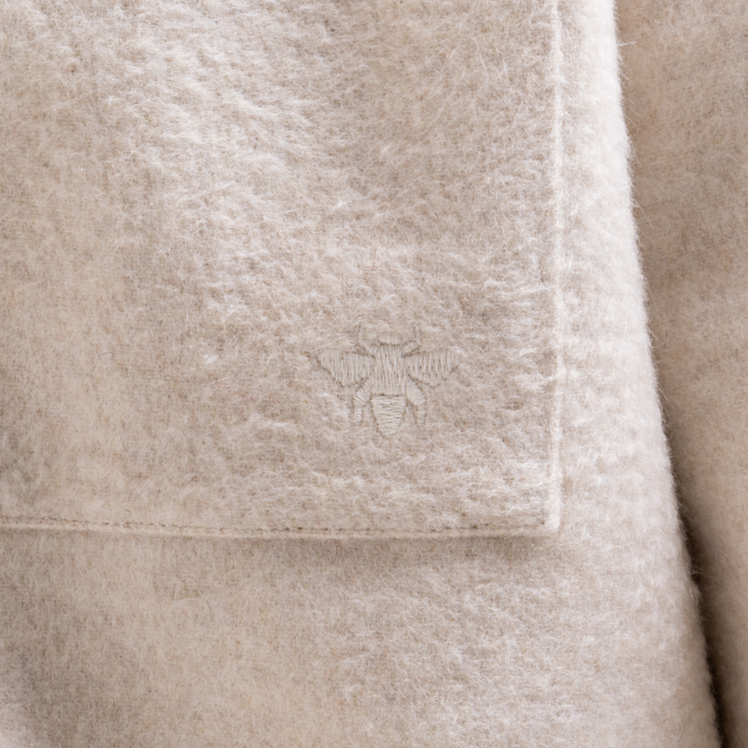 The Courtois Overshirt in ecru features a brushed fabric that provides warmth and softness, ideal for layering throughout the seasons. Its neutral tone is versatile, while subtle tonal Bee branding adds an elevated touch and is designed with a convenient snap fastener at the front.