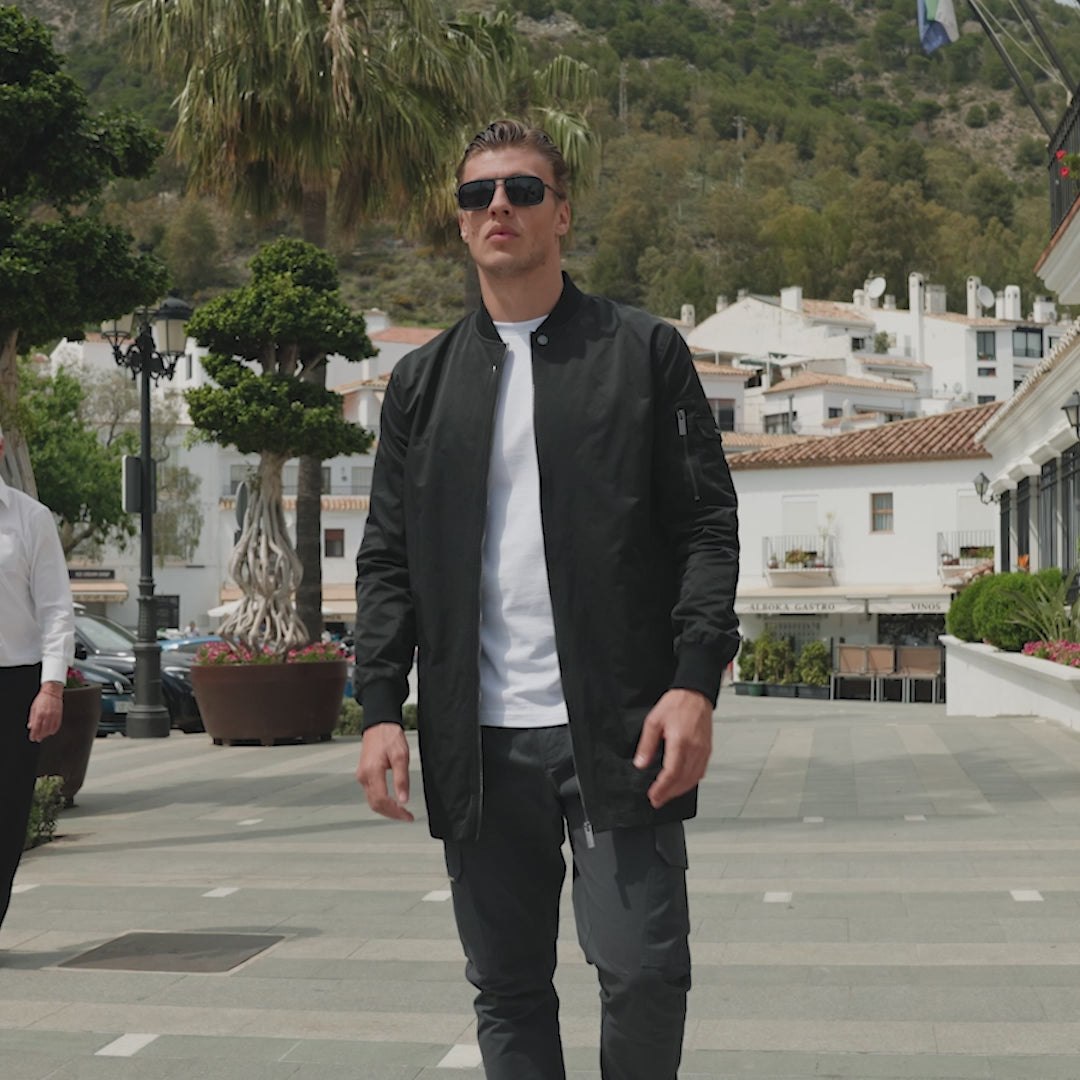Regular fit longline bomber jacket in black. Featuring a baseball style neckline with sleeve and hip pockets. It has a zip front fastening with branded snap fasteners, zip pullers, and lining. It also has a utility style pocket on the arm, branded with our premium metal badge. The Neves is perfect for the upcoming party season.
