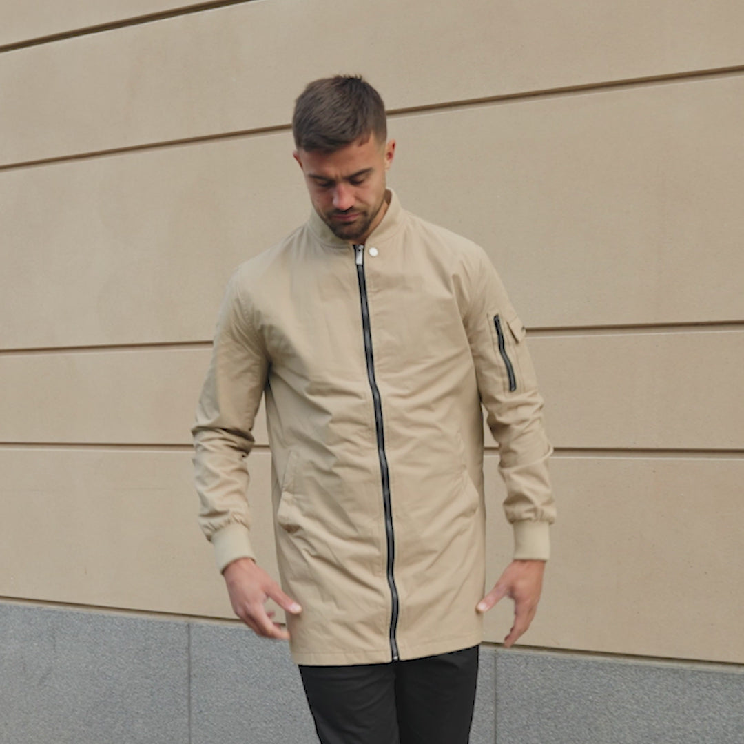 Regular fit longline bomber jacket in sand. Featuring a baseball style neckline with sleeve and hip pockets. It has a zip front fastening with branded snap fasteners, zip pullers, and lining. It also has a utility style pocket on the arm, branded with our premium metal badge. The Neves is perfect for the upcoming party season.