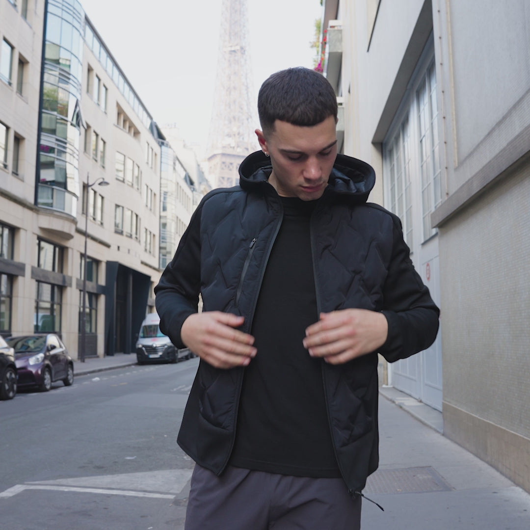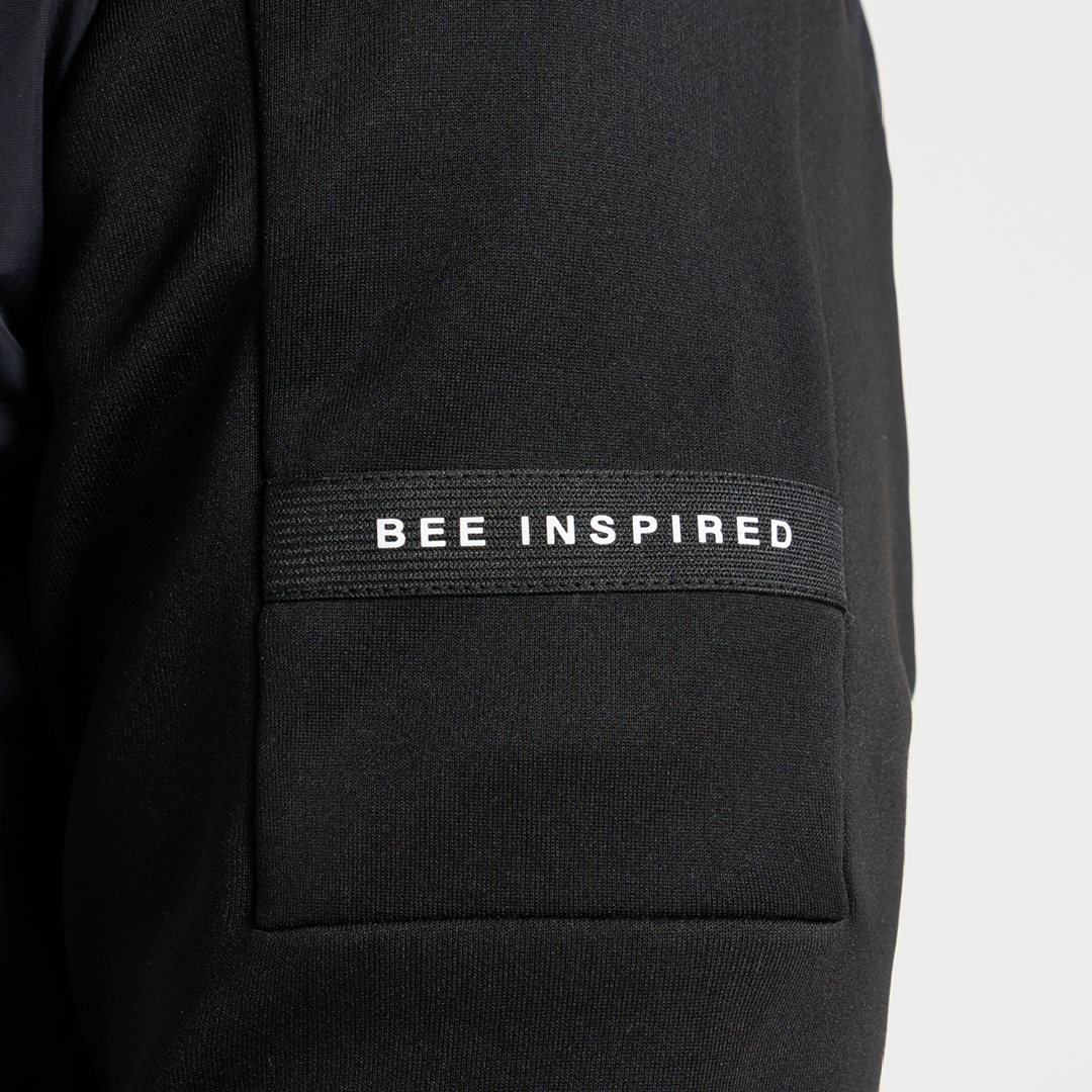 Sporty style chevron quilted jacket in Black. Features neoprene sleeves, hood, and back body. It has branded aglets, eyelets, zip puller, and lining. It is also branded with raised print tonal Bee Inspired branding on the sleeve panel in our iconic terrace style.